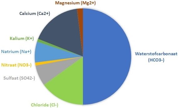 Gemiddelde drinkwatersamenstelling naar relatief gewicht van opgeloste stoffen. Bron: Lenntech
